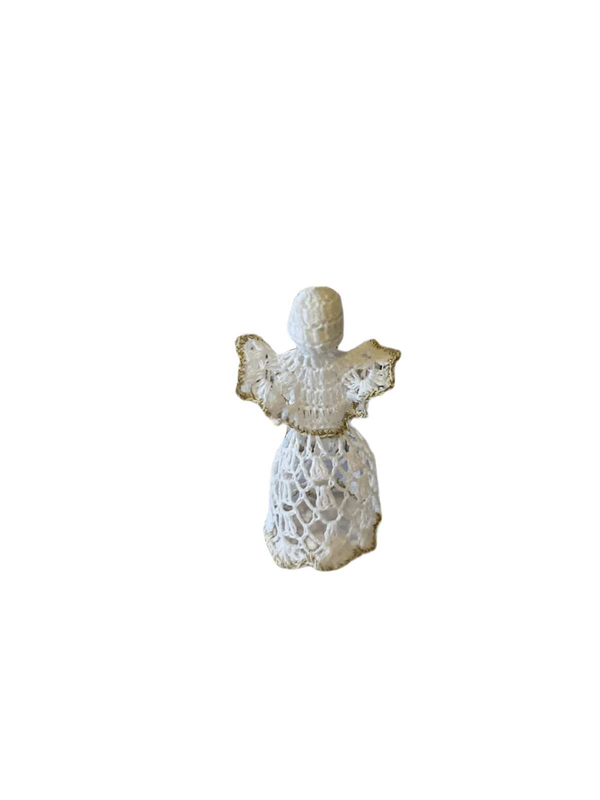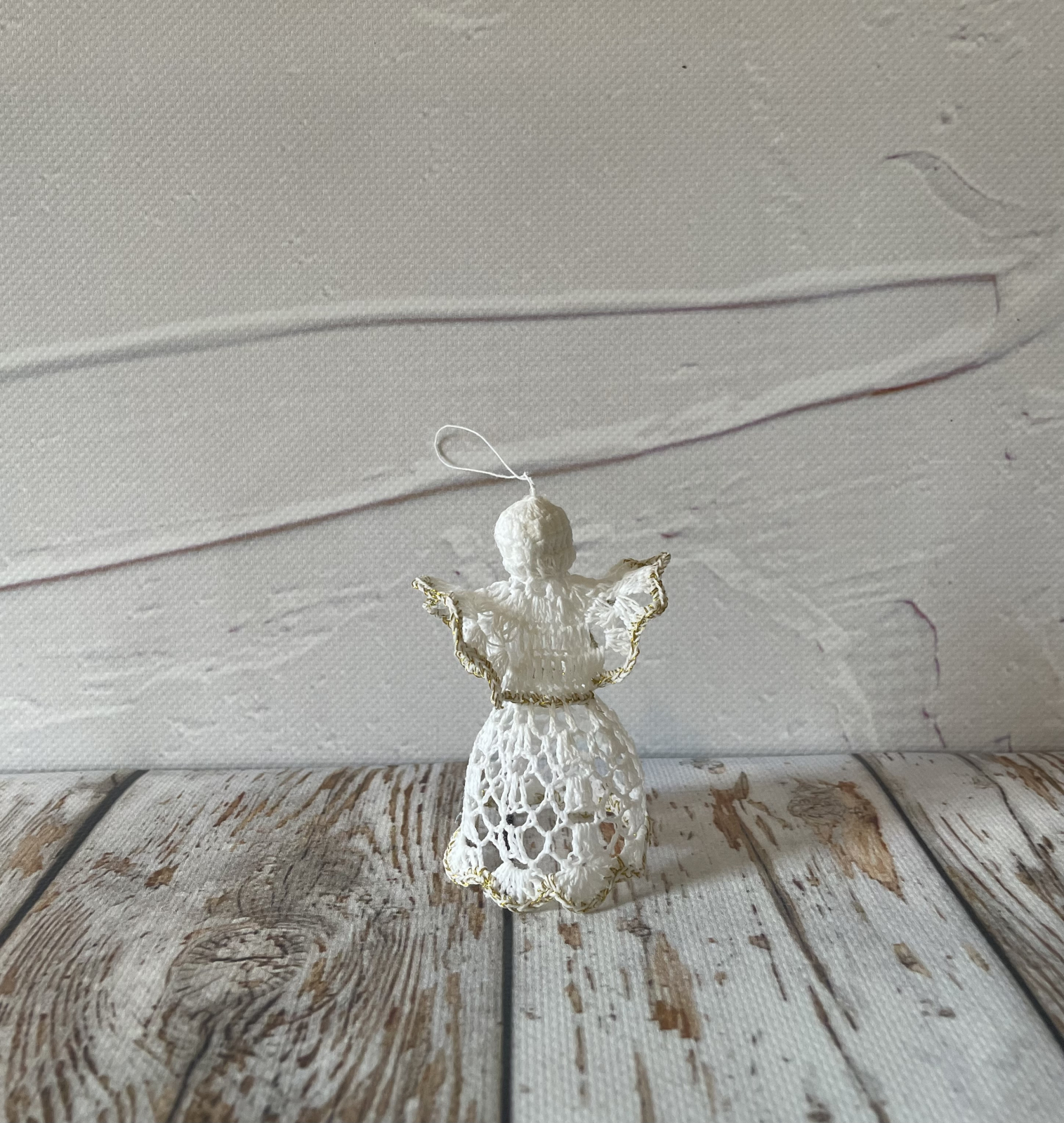 Decorațiune înger croșetat, alb cu auriu. Dimensiune: aproximativ 9 cm. Fiecare înger este unic și prezintă mici diferențe. Îngerul are o agățătoare din fire, astfel încât poate să fie atârnat și încadrat în diverse locuri.