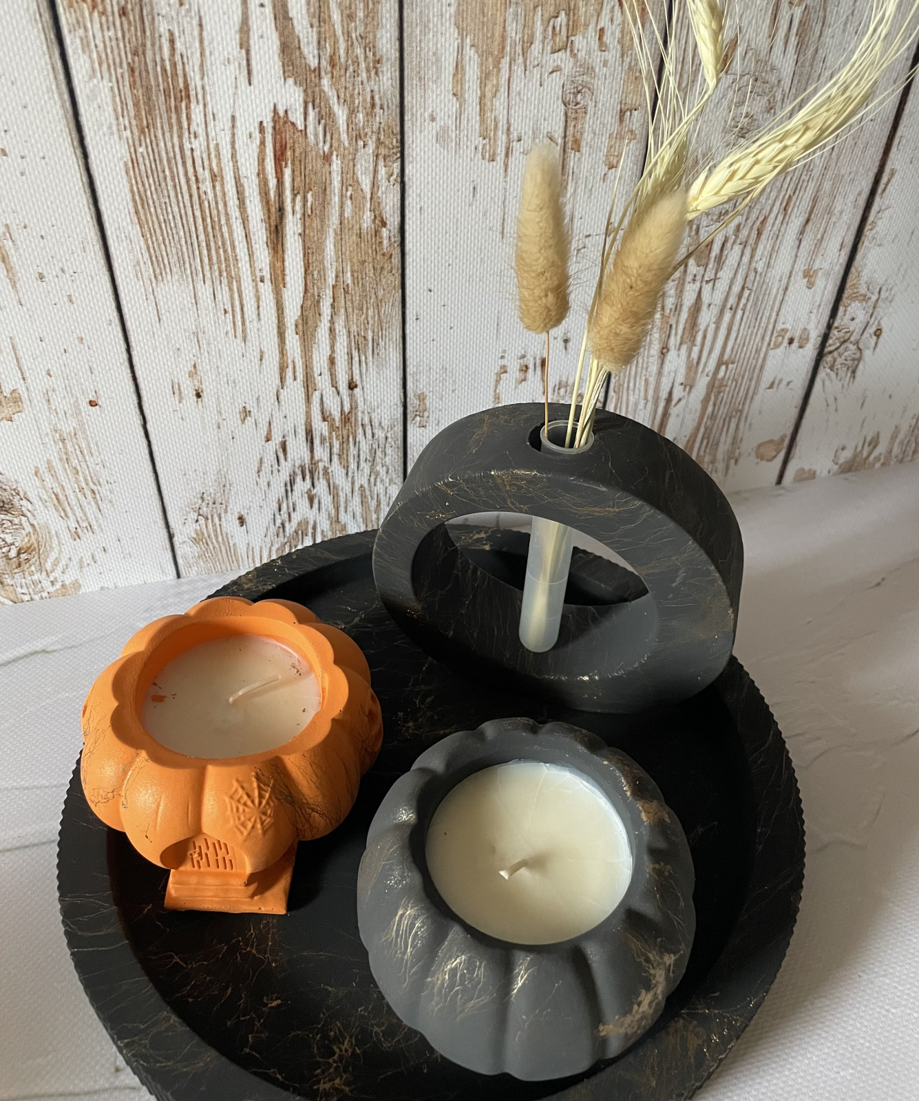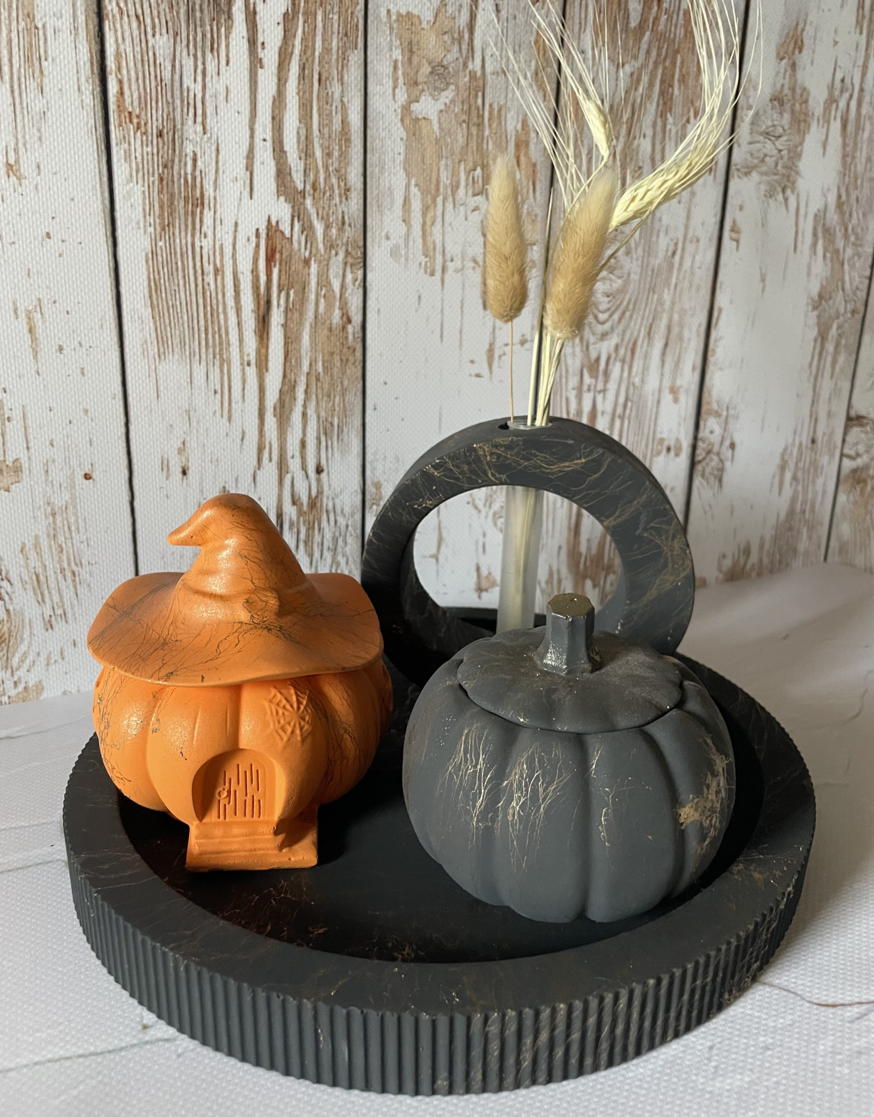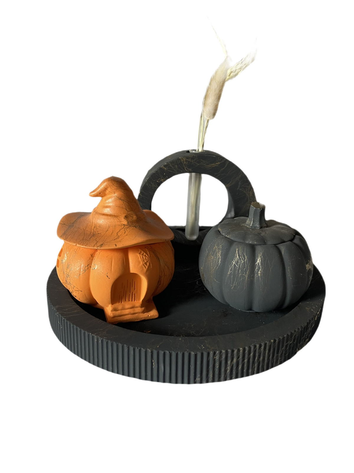 Decorațiune de toamnă formată din 4 elemente: tăviță, vază cu flori uscate și două lumânări. Dimensiuni: