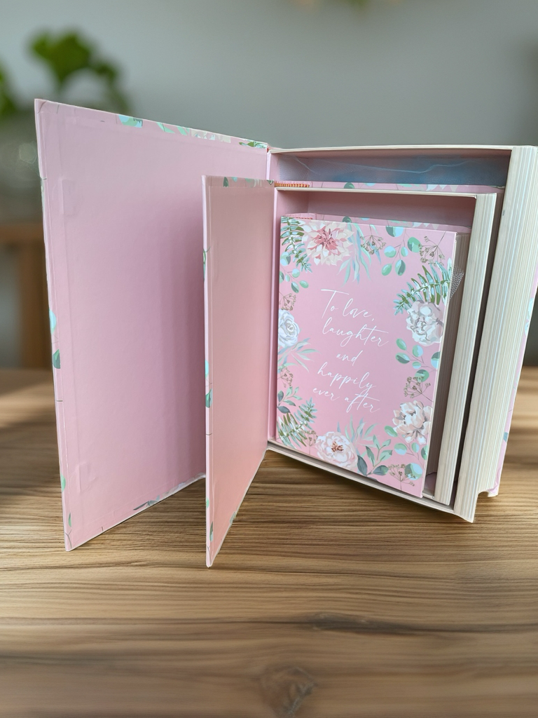 Transformă orice cadou într-o experiență elegantă cu acest set de 3 cutii cadou tip carte, perfect pentru ambalaje premium și prezentări deosebite. Realizate din carton rigid de înaltă calitate, cutiile sunt decorate cu un design floral romantic în nuanțe de roz pastel și cu mesajul inspirațional: To love, laughter and happily ever after. Setul este ideal pentru cadouri de nuntă, aniversări, cosmetice, bijuterii, suveniruri, sau pentru organizarea decorativă în casă. Cutiile sunt concepute în format 3 în 1, fiecare având dimensiuni diferite și putând fi depozitate una în alta. Acest lucru le face ușor de păstrat și foarte versatile, fiind o alegere excelentă pentru magazine, evenimente sau ambalaje personalizate.