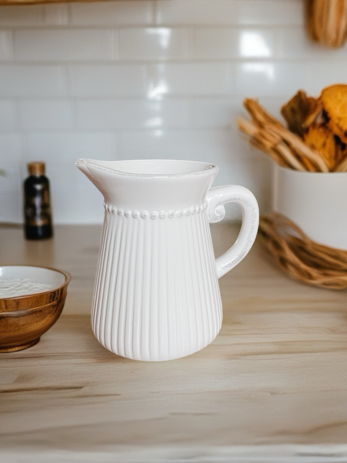 Descoperă versatilitatea și eleganța acestei carafe ceramice albe, un accesoriu rafinat ce completează perfect orice bucătărie sau masă festivă. Cu o capacitate de 750 ml, o înălțime de 15cm și o bază stabilă de 11 cm, această carafă este ideală atât pentru utilizare practică cât și ca piesă decorativă. Textura sa fină, vertical striată și finisajul lucios îi oferă un aspect clasic, potrivit pentru stiluri scandinave, vintage sau rustice. Poate fi folosită pentru servirea laptelui, apei, sucului chiar și ca vază pentru flori, aducândun plus de farmec pentru orice încăpere .
